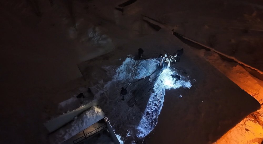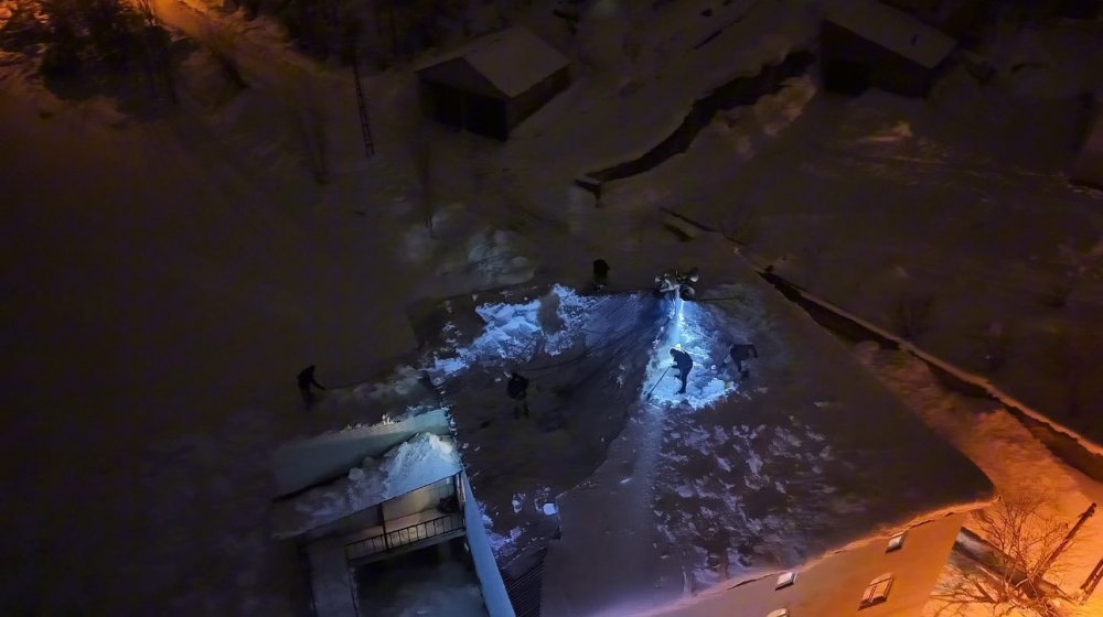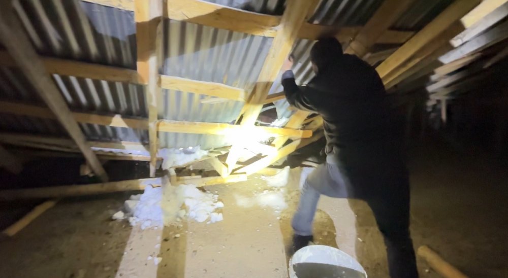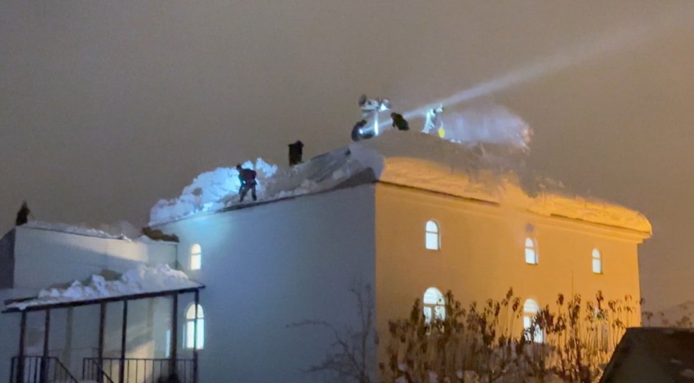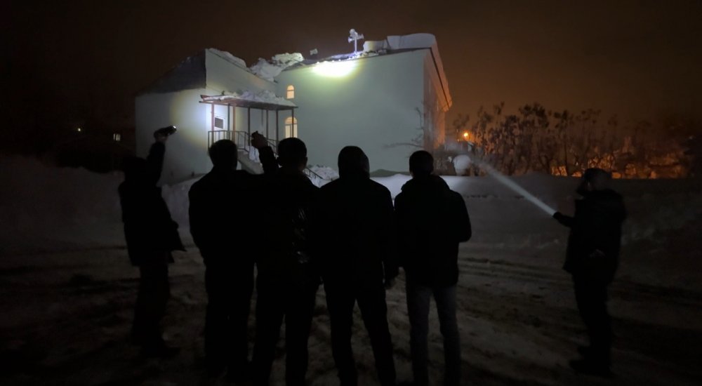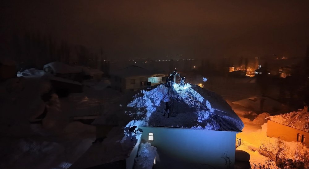 Dondurucu soğuğa rağmen çatının üzerine çıkan vatandaşlar, çökmenin devam etmemesi için biriken kar kütlelerini tahliye etti.