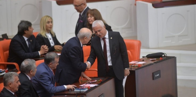 MHP'den ayrılıp İYİ Parti'ye katılan Koray Aydın, Meclis'teki yemin töreni sırasında Bahçeli'nin yanına gitti. Tokalaşan ikili bir süre sohbet etti.