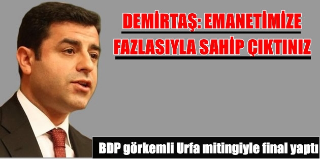"63 gün önce yine bu meydanda arkadaşlarımızı önce Allah'a sonra sizlere emanet edip gitmiştik. Şimdi görüyoruz ki emanetimize fazlasıyla sahip çıkmışsınız" diyerek konuşmasını sürdüren Demirtaş şöyle dedi: "Urfa meydanındaki bu kitle ile kararınızı vermişsiniz. Urfa'da kimsenin tahmin edemeyeceğini bugün başardınız. Artık BDP Urfa'da iktidar olmaya hazır hale geldi. Sizler bunu zorlu bir mücadele ile başardınız. 63 gündür burada bütün Türkiye'deki bütün adaylara örnek olacak bir çalışma sergileyen adaylarımızı canı gönülden kutluyoruz. İnanın ki öyle yerlerde öyle seçim kampanyalarını gördük ki. Sizler siyasi liderlerin seçim meydanlarındaki konuşmalarını gördünüz. Mübarek sanki seçimlere değil de savaşlara gidiyorlardı. Halkın karşısına çıkacak doğru dürüst işleri olmadığı, siyasetin ele ayağa düştüğü ve kepazelik durumuna düştüğü birçok yerde oy istemeye çalıştılar."