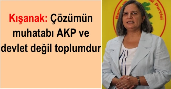 AKP hükümetinin ilk günden bu yanan köklü bir zihniyet değişimin peşinde olmadığını dile getiren Kışanak, "Tutum, davranış ve politikalarıyla bunu açığa çıkarıyor. AKP hükümeti tekçi devlet zihniyetinin bir ürünüdür. Her şey oldu bitti noktasında değiliz. Son kaç aydır ölümler durdu. Bu çok önemli bir gelişme ama sorunlarımız halen çözülmüş değil. İmralı'da görüşmeler yapılıyor diye rehavete kapılmak doğru değil. AKP hükümeti sürecin ruhuna uygun adım atan bir iktidar değil. Bizim zaten kimseden inayet bekler gibi barışı beklememiz söz konusu değil. Bunu kendi emek ve mücadelemizle yaratacağımızın farkındayız. Şunu artık herkesin görmesi gerekiyor. 20 yıllık bir barışı gerçekleştirme çabası var. 21 yıllık bir deneyim var ortada. Bütün bu yılların her birinde yaşadığımız her bir deneyimden çıkardığımız dersler var. Gelinen aşamada da artık bu yol kesintisiz bir şekilde ilerlemenin koşullarına sahip olmuştur. Bugün kışkırtılan, ırkçılığa teşvik edilen, yer yer linç girişimlerinde bile kullanılan Türkiye toplumunun bile çok büyük bir kesimi çözüm istiyor. O zaman biz çözümün muhatabını bulduk. Çözümün muhatabı AKP, devlet değil. Türkiye toplumudur. Biz bu muhataplığı giderek güçlendiren, derinleştiren bir çalışmayla bu yolda yürüyeceğiz. Bu yola gelen gelir, gelmeyen de tarihin çöp sepetine atılır. Bu da kendilerinin bileceği bir iştir. İsterlerse demokratik çözüm sürecine dâhil olsunlar, kendileri de bir aktör olarak üzerlerine düşen görevi yaparlarsa bu yolda onlarda yürüyebilirler. İsterlerse aksini yapsınlar ve geriye dönüp baksınlar. Ayak direyen çözümsüzlüğü dayatan, yapıyormuş gibi yapıp yapmayanlar bunların hepsinin sonu kaderi bellidir. Çünkü istikamet çözüme doğrudur. Kimse artık bu tarihi tersine çeviremez" dedi.