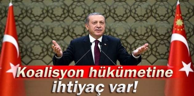 “Anayasa’nın verdiği çerçeve içerisinde ve milletimizden aldığımız güçle ülkemize hizmet etmenin çabası içerisindeyiz” diyen Erdoğan, “Bu çerçevede 7 Haziran seçimlerinden sonra ortaya çıkan tablonun bu nezaketi de dikkate alarak Türkiye’yi bu durumdan en sağlıklı bir şekilde çıkartmayı hedefleyen bir yol izliyoruz. Seçim sonrasında meclisin toplanması milletvekillerinin yemin etmesi, meclis başkanının seçilmesi ve son olarak meclis başkanlık divanının oluşumunu yakından takip ettik. Bu dönemde meclise giren partilerin koalisyon ile ilgili görüşlerinin olgunlaşmaya başladığını, dolaylı da olsa görüşlerin, niyetlerin, şartların netleştiğini gördük. Dün teamüllere uygun olarak en çok oy alan partinin genel başkanı ve mevcut Başbakanımız Ahmet Davutoğlu’na görevi verdim. Sayın Davutoğlu’na şimdiden başarılar diliyorum. Temennim Türkiye’nin içerisinde bulunduğu hassasiyetlerine uygun bir şekilde yeni hükümetin kurulmasıdır. Bu konuda tüm partilere sorumluluk düşüyor. Bugün Türkiye’nin geçmişini tartışan değil, mevcut sorunların çözümü ve geleceğin inşası konusunda irade ortaya koyacak bir koalisyon hükümetine ihtiyaç var. Böyle bir uzlaşma sağlanamadığı takdirde her zaman ifade ettiğim gibi çözüm mercii neresidir? Yine biziz. Millete gidilecek mademki siz bu işi çözemediniz o zaman millet olarak biz çözeceğiz. Burada bir hususu özellikle belirtmek istiyorum. Cumhurbaşkanlığı görevini üstlendiğimden beri yaptığım her şey Anayasa’ya ve milletime olan taahhütlerime uygundur. Şahsımla ve makamımla ilgili olarak ortaya atılan iddialar iftiradan, yalandan ve yanlıştan ibarettir. Cumhurbaşkanı olarak hukukun dışına çıkan en ufak bir tasarrufum, en ufak küçük bir adımım ve girişimim olmadı olmayacak. Ortaya atılan iddiaların bir kısmı Cumhurbaşkanını milletin seçmesiyle birlikte yeni bir döneme girildiğini göremeyenlerin anlamayanların hezeyanlarından ibarettir. Cumhur ile Başkanın Beştepe’deki Külliye’de bütünleşmesinden rahatsız olanlar sürekli akıl ve izan sınırlarını zorlayan iddiaları gündeme getirerek kendilerince algı operasyonu yapıyorlar. Ne yapsalar boş” diye konuştu.