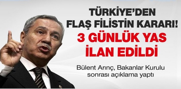 Bülent Arınç, Gazze'de yaşananları değerlendirerek; "Bakanlar Kurulu'muzda 3 günlük yas ilan edilmesi kararı alındı. Yarın sabah itibariyle uygulamanın başlamasını, Salı, Çarşamba ve Perşembe günlerinde Türkiye'de Filistin halkıyla dayanışma içinde olduğumuzu göstermek bakımından yas ilan edilmesi kararı verilmiştir" dedi.