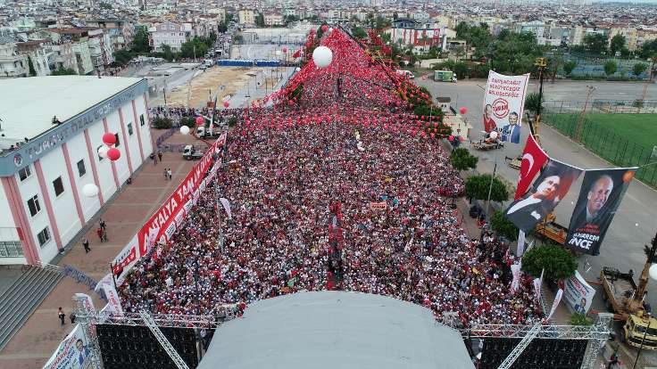 Rusya’yla yaşanan uçak krizini hatırlatan İnce, “‘Rus uçağını ben düşürdüm Suriye sınırında’ dedi. Ama uçak Antalya’ya düştü. Rus turist Antalya’ya gelmez oldu. Ne diyoruz 3B projemiz var. Barışacağız, hemen barışacağız. Büyüyeceğiz hemen büyüyeceğiz. Mahkemelerimiz bağımsız olacak. MB personellerini parti merkezinde ağırlamayacağız. Partizanlık yapmayacağız. Halkça bölüşeceğiz, adilce bölüşeceğiz” diye konuştu.