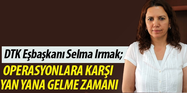 Gözaltı ve tutuklamaların fiili ateşkesin bitirilmesi anlamına geldiğini ifade eden DTK Eşbaşkanı Selma Irmak, KCK'nin "Gözaltı ve tutuklama bizim için misillenme gerekçesidir" sözünü hatırlatarak, "HDP, Kürt siyaseti ve devrimciler olarak gözaltı, tutuklama furyası, savaşa karşı bir politik hamle geliştirmek gerekiyor. Bizim esas aldığımız toplumsal ittifaktır. Toplumsal ittifakı yan yana getirmenin tam zamanıdır. Bugün değil de ne zaman diye sormak gerekir?" dedi.