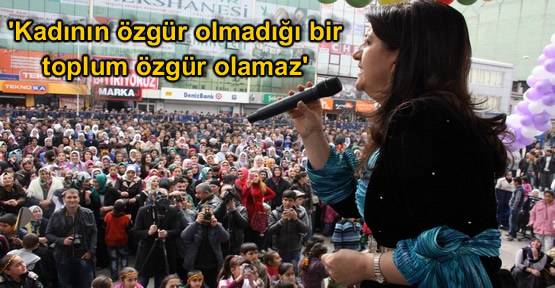 Müzik dinletisinin ardından konuşan BDP Iğdır Milletvekili Pervin Buldan, "Sevgili kadınlar size İmralı'dan Sayın Öcalan'ın selamlarını getirdim. Yanına giden biri olarak yüz yüze gören biri olarak selamını getirdim. Sayın Öcalan, 'Kadının özgür olmadığı bir halk özgür olamaz' diyor, bizler bunun için alanlardayız" dedi. Yürütülen özgürlük mücadelesinde kadınların ön safta yer aldığını vurgulayan Buldan, "Bugün Sayın Öcalan'ın başlattığı, kadın özgürlük hareketi ile kadınlar her alandadır. Kadınlar yaşamın her alanında kendi sesi ile haykırmaktadır. Bugün biz kadınların alanlarda olmasını sağlayan Sayın Öcalan'a bir kez daha teşekkür ediyoruz. Kadın özgürlük mücadelesinde şehit düşen yoldaşlarımızı saygıyla anıyorum. Cezaevlerinde tutuklu bulunan tutsak kadın yoldaşlarımızı selamlıyorum" dedi.