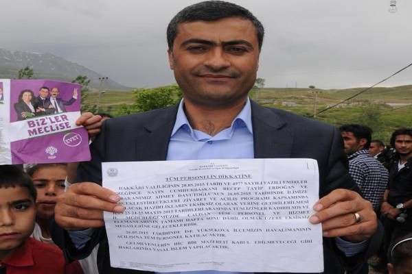 Burada konuşan milletvekili adayı Abdullah Zeydan, Cumhurbaşkanı Recep Tayyip Erdoğan ve Başbakan Ahmet Davutoğlu'nun katılımıyla Yüksekova'daki havaalanı açılış törenine vatandaşların katılmayacağını iddia etti. Bu nedenle Hakkari Valiliği talimatıyla kentteki tüm kurumlara açılışa katılmaları için resmi yazı gönderildiğini söyleyen Zeydan, "Havaalanının açılışına Hakkari halkının gelmeyeciğini çok iyi biliyor. Bundan dolayı devlet kurumlarında görev yapan memurlara valilik tehditle "Ya siz bu açılışa geleceksiniz ya da biz bunun hesabını sizden soracağız' diyor. Bir kurumun kendi panosuna astığı yazıda, 26 Mayıs 2015 tarihinde Cumhurbaşkanı ve Başbakananın katılacağı Yüksekova Havaalanı açılışına katılımın mecburi olduğu, gelmeyenlerin hiçbir mazareti kabul edilmeyeceği gibi halklarında resmi işlem yapılacağı belirtilmiş. Resmen Hakkarili, Yüksekovalı, Şemdinlili, Çukurcalı memur kardeşlerimizi tehdit ediyorlar" dedi.Dha