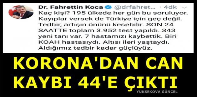 Bakan Koca, Türkiye'de Korona'da 7 vatandaşın daha hayatını kaybettiği ve can kaybı ise 44 olduğunu belirtti.
