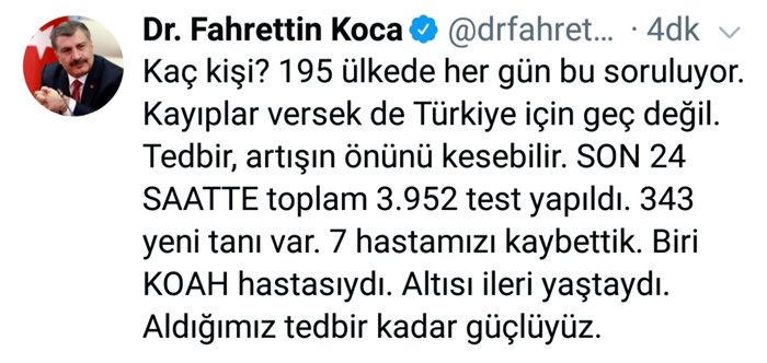 Bakan Koca: Kaç kişi? 195 ülkede her gün bu soruluyor. Kayıplar versek de Türkiye için geç değil. Tedbir, artışın önünü kesebilir. SON 24 SAATTE toplam 3.952 test yapıldı. 343 yeni tanı var. 7 hastamızı kaybettik. Biri KOAH hastasıydı. Altısı ileri yaştaydı. Aldığımız tedbir kadar güçlüyüz.İfadelerini kullandı.