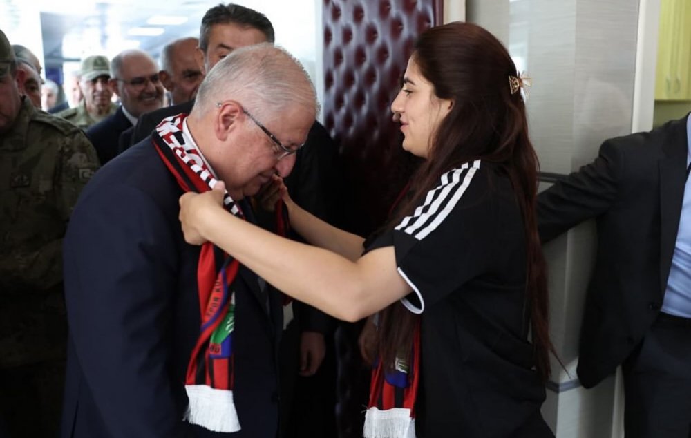 Hakkari'de çeşitli temaslarda bulunmak üzere şehre gelen Milli Savunma Bakanı Yaşar Güler, Yüksekova Spor Kulübü Kadın Futbol Takımı ile Selahaddin Eyyubi Havalimanı'nda bir araya geldi.