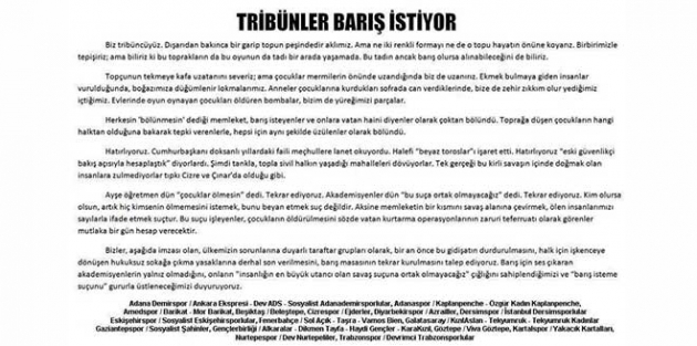 “Bizler, aşağıda imzası olan, ülkemizin sorunlarına duyarlı taraftar grupları olarak, bir an önce bu gidişatın durdurulmasını, halk için işkenceye dönüşen hukuksuz sokağa çıkma yasaklarına derhal son verilmesini, barış masasının tekrardan kurulmasını talep ediyoruz. Barış için ses çıkaran akademisyenlerin yanlız olmadığını, onların ‘insanlığın en büyük utancı olan savaş suçuna ortak olmayacağız’ çığlığını sahiplendiğimizi ve ‘barış isteme suçunu’ gururla üstelenceğimizi duyuruyoruz.”