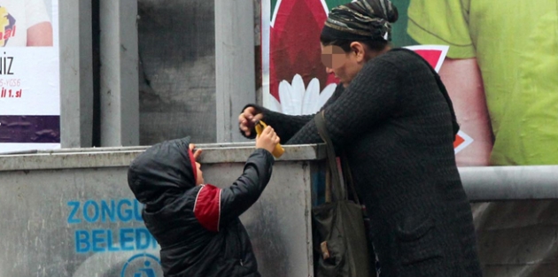 Çöplerin arasında yiyecek arayan, bulduğu boş şişe, karton gibi atıkları da satarak gelir sağlayan kadın, Terakki Mahallesi Cumhuriyet Caddesi'ndeki belediyenin çöp konteynerini karıştırırken muz buldu. İsmini söylemek istemeyen kadın, muzu yanındaki çocuğuna verip çöpü karıştırmaya devam etti. Çöpte işine yarayan başka bir şey bulamayan kadın, muzu cebine koyan çocuğu ile caddeki kalabalığa karışarak gözden kayboldu.