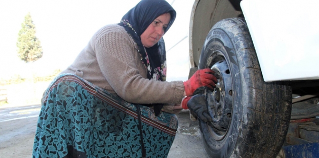 Lastik tamircisi 3 çocuk annesi kadın görenleri şaşırtıyor