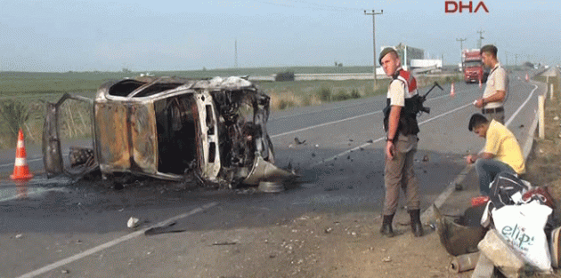 Kaza, Ankara'da yaşayan Sadettin ve İbrahim Aslan kardeşlerin, bir yakınlarının düğün törenlerine katılmak için bu sabah Balıkesir'e gitmek istemeleri sonucu meydana geldi. İddiaya göre Sadettin Aslan'ın kullandığı 06 MB 561 plakalı otomobil, Bursa çıkışı Marmarabirlik Tesisleri'nin yakınlarında bariyerlere çarpıp takla attı. Kaza sonrası alev alan LPG'li araç tamamen yanarken otomobilde bulunan Ramazan Aslan (44) öldü, sürücü Sadettin Aslan ile kardeşi İbrahim Aslan ile Döne ve Burak Aslan ağır yaralandılar.