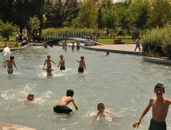 Diyarbakır'da 45 dereceyi bulan hava sıcaklığından korunabilmek için çocuklar çareyi Koşuyolu Parkı'nda bulunan havuza girmekte buldu.