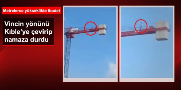 Operatör, vincin yerden yaklaşık 80 metre yüksekliğindeki denge bölümünde namaz kılarken bir vatandaş tarafından böyle görüntülendi.
