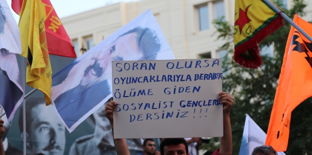 Suruç katliamını onbinlerin lanetlediği İstanbul'da yürüyüş sonrası yapılan açıklamalarda, saldırının amacının Rojava Devrimi'ne ve halkların ortak mücadelesine dönük olduğu ve katliamın DAİŞ, AKP ve MİT organizasyonuyla gerçekleştiği vurgulandı. Eylemde kitlenin taşıdığı "Soran olursa oyuncaklarıyla beraber ölüme giden sosyalist gençler dersiniz!!!" dövizi ise tüm duyguları anlatır nitelikteydi.