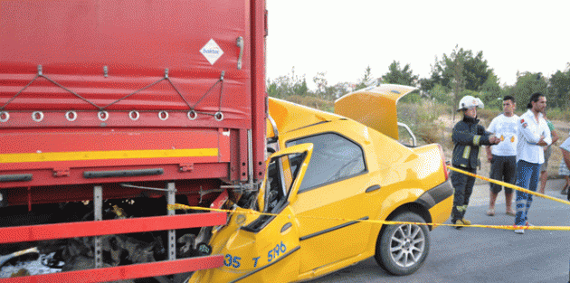 Kaza, bugün saat 06.30 sıralarında Buca Çevre Yolu'nda meydana geldi. Özcan Tanrıverdi yönetimindeki arıza yapan 31 TE 802 plakalı TIR'ı emniyet şeridine park etti. Bu sırada Hakan Araş yönetimindeki 35 T 5196 plakalı taksi TIR'a arkadan çarptı. Kazayı gören çevredekiler durumu sağlık ve polis ekiplerine bildirdi.