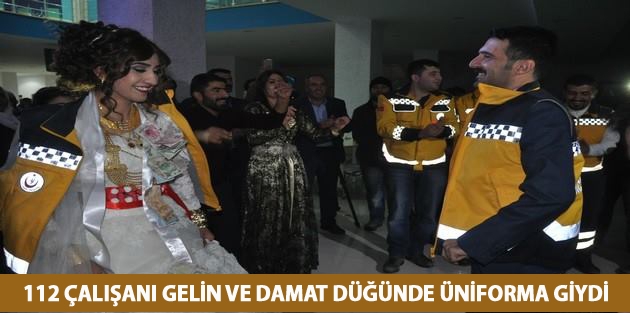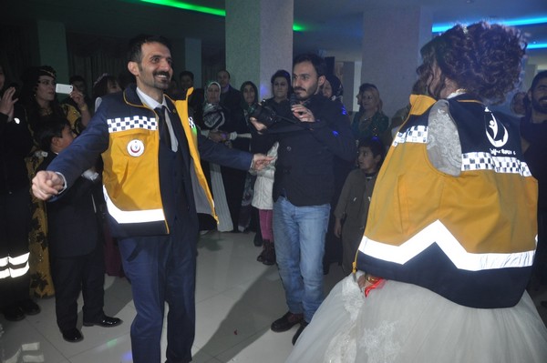 YÜKSEKOVA-Hakkari'nin Yüksekova İlçesi'nde 112 Acil Servis çalışanı Bahar Akkuş ile İlhak Yalın, düğüne katılan sağlık çalışanları gibi üniforma giydi.