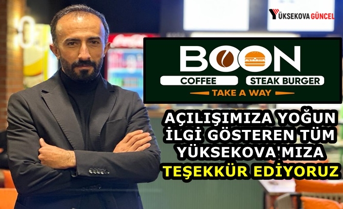 'Boon Coffee' sahipleri yayınladıkları teşekkür mesajında, ''Yüksekova şubemizin açılışına iştirek eden; Hakkari Valimiz Ali Çelik, Yüksekova Kaymakamımız Ömer Çimşit, Büyükçiftlik Belde Belediyesi Başkanı İsmail Rüştü Zeydan, Esendere Belde Belediyesi Başkanı Dırbaz Büyüksu, Yüksekova Belediyesi Başkan Yardımcıları Feyzi Yıldırım, Kerim Bulut, Mehmet Akif Arslan, MÜSİAD Hakkari Başkanı Adnan Öveç, Yüksekova Ticaret ve Sanayi Odası Başkanı Salih Özdemir, Yüksekova Esnaf ve Sanatkarlar Odası Başkanı Vedat Çoğaç, Yüksekova Ziraat Odası Başkanı Perviz Geçirgen, Yüksekova Şoförler ve Otomobilciler Esnaf Odası Başkanı Selami Durna, Demeter Tarım Kooperatifi Başkanı Bahar Sağkol ve Yönetimine, Merkez ve Köy Muhtarlarına, Selahaddin Eyyubi Mesleki ve Anadolu Müdürü Ersin Evinve diğer okul müdürleri ile yönetimine, Modex Şirketin Sahibi Yasin Arslan ve Yönetimine, Nişan AVM, Yaşam AVM, Uğur AVM, tüm Yüksekova Esnafı, eş, dost ve akrabalarımıza BOON AİLESİ OLARAK sonsuz teşekkürlerimizi sonuyoruz.
