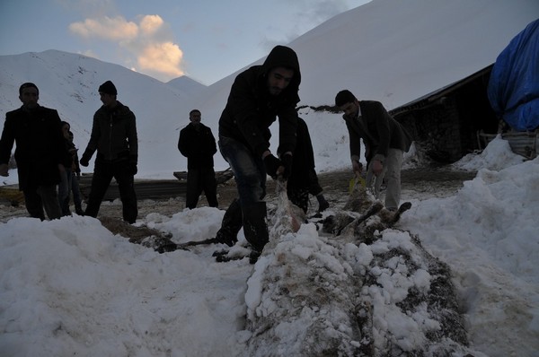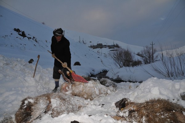 İnen çığın altında kalarak yıkılan ahırdaki koyunlardan 50’si telef oldu. 7 çocuk babası Ahmet Atila, yaptığı açıklamada, köyde üç metreye yakın kar yağdığını dile getirerek, ahırın inen çığ nedeniyle yıkıldığını belirtti.