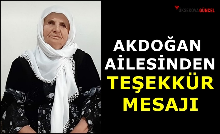 AKDOĞAN AİLESİ MESAJINDA, "Tüm eş, dost, akraba ve hemşehrilerimiz gerek cenaze törenine ve gerekse taziyemize gelerek veya telefonla arayarak bizleri bu acı günümüzde yalnız bırakmadılar. Uzaktan yakından cenazemize katılan, taziye ziyaretinde bulunan, mesaj gönderen, telefonla başsağlığı dileyen, Yurt içinde ve Yurt dışında başta İran ve Irak olmak üzere internet aracılığı ile mesajını ileten, definden önce ve sonra taziyemize gelip acımızı paylaşan, tüm kanaat önderlerine, yerel yöneticiler, Milletvekillerine, belediye başkanları, siyasi parti temsilcileri, kurum amirleri, Mahalle Muhtarlarına, gazeteciler, baro başkanları, öğretmenler, sağlıkçılar Türkiye'nin her yerinden dualarını esirgemeyen akrabalarımıza, Maddi ve Manevi desteklerini bizlerden esirgemeyen herkese şükranlarımızı sunarız" İfadeleri kullanıldı.