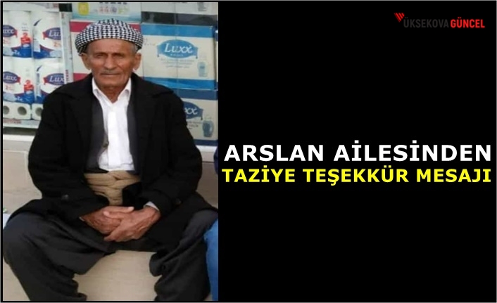 ARSLAN AİLESİ MESAJINDA,''Aile Büyüğümüz Hacı Aziz Arslan'ın vefatı nedeniyle bizleri yanlız bırakmayan, acımızı paylaşan, taziyemize iştirak eden, gerek Yüksekova ilçemizin sınırları içinde, ülkemizin muhtelif kentlerinde ve yurt dışından acımıza ortak olup bize teselli veren kıymetli akrabalarımıza, komşularımıza, dostlarımıza ve hassaten Yüksekovalı hemşerilerimize, muhterem büyüklerimize göstermiş oldukları ilgi ve alakadan ötürü ailemiz adına şükranlarımızı sunuyoruz.''