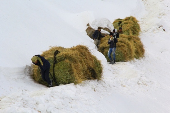 Canları pahasına hayvanlar için dağdan kızaklarla ot taşıyorlar