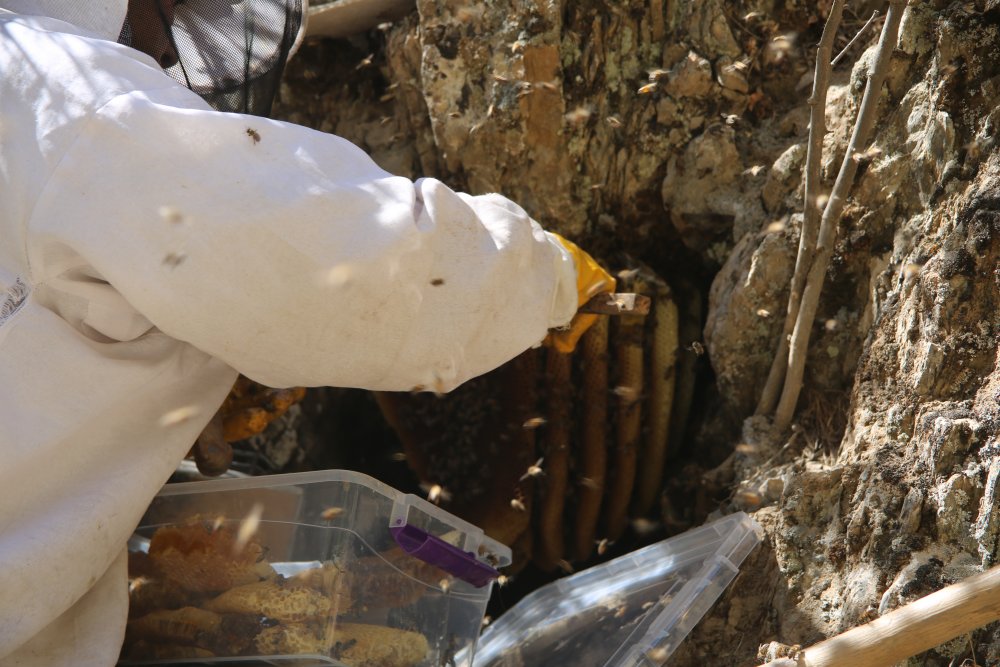 İlkbaharda tespit ettiği alanı ayılardan korumak için gece gündüz nöbet tutarak kaya balının hazır olduğu eylül ayına kadar bekleyen Yiğit, balları tüm tehlikelere rağmen 2200 rakımlı dağa tırmanarak topladı.