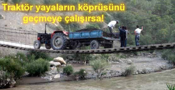 Suyun öbür tarafında bulunan çiftlikteki sera bahçesine hayvan gübresi taşımak isteyen çiftçi, gübre yüklü traktörü asma köprüden geçirmeye çalıştı. Ancak traktörün römorku oldukça dar olan köprüyü tutan halatlara bağlı koruma tellerine takıldı. Traktör sürücüsü ve yanında bulunanlar uzun süre traktörü takıldığı tellerden kurtarmaya çalıştı. Saatler süren traktörü asma köprüden geçirme çabaları, ortaya bu görüntüleri çıkardı. DİHA