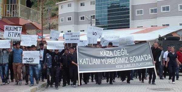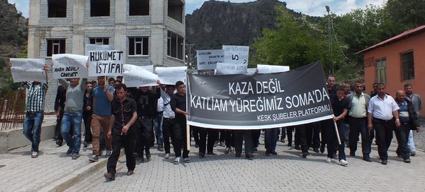 Yürüyüşte Hükümet istifa, Hükümet istifa, yüz karası değil kömür karası, maden işçileri ölmedi öldürüldü yazılı dövizler taşındı.