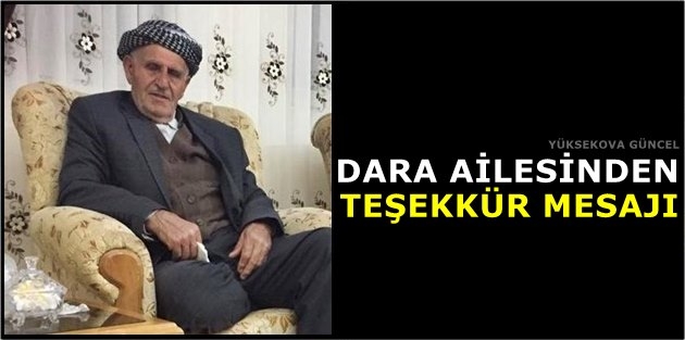 Taziyemizde acımızı paylaşan, yardımlarını esirgemeyen köyümüzün değerli sakinleri komşularımıza,, yurtiçi ve yurtdışından telefonla, maillerle ve sosyal medya aracılığı ile baş sağlığı dileklerini sunan dost ve akrabalarımıza;Başta Hakkari, Yüksekova, Şemdinli, Çukurca, Derecik ve Başkale olmak üzere bizleri bu acılı günümüzde yalnız bırakmayan dualarıyla yanımızda olan tüm bölge halkına;Siyasi partilerin genel merkez ve il ile ilçe yönetimlerine, Hakkari’nin eski ve yeni dönem milletvekillerine, belediye başkanlarına, Hakkari Barosu ve yönetimine, sivil toplum örgütü başkan ve yöneticilerine, İran, Irak, Suriye, Kanada, Norveç, Almanya, Danimarka, Federal Kürdistan bölgesi ile Diyarbakır, İstanbul, Ankara, İzmir, Uşak, Van, Muş, Bursa, Elazığ, Şırnak, Trabzon’dan telefonlar aracılığı ile acımıza ortak olan dost ve akrabalarımıza Hakkari ve ilçelerinde çalışan basın mensuplarına, Aile Büyüğümüzün arkadaşlarına, tüm dost ve akrabalarımıza; TEŞEKKÜR EDER, ŞÜKRANLARIMIZI SUNARIZ... AİLE ADINA KARDEŞİ: MEHMET DARA – OĞLU: ZEKİ DARA