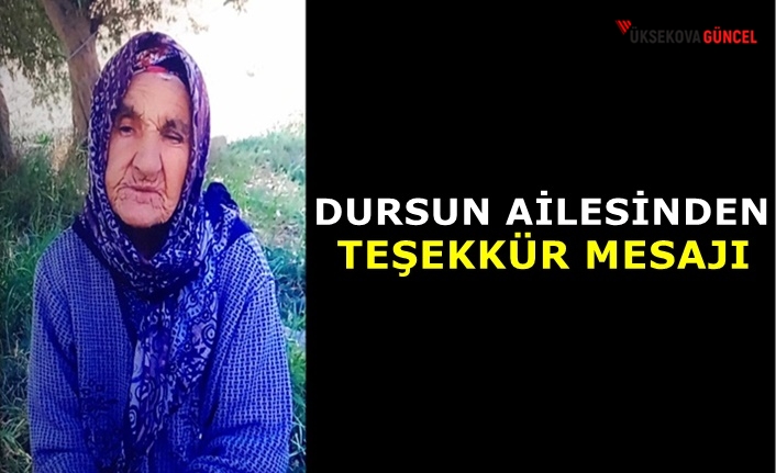 DURSUN AİLESİ MESAJINDA, "Değerli Aile Büyüğümüz Kıymet Dursun'un vefatı nedeniyle bizleri yalnız bırakmayarak acımızı Paylaşan Tüm Eş, Dost, Akraba ve Hemşehrilerimiz gerek cenaze törenine ve gerekse taziyemize gelerek veya telefonla arayarak bu acı günümüzde bizimle beraber oldular, acımızı paylaştılar… Uzaktan yakından cenazemize katılan, taziye ziyaretinde bulunan, mesaj gönderen, telefonla başsağlığı dileyen, internet aracılığı ile mesajını ileten, definden önce ve sonra taziyemize gelip acımızı paylaşan, tüm kanaat önderlerine, yerel yöneticilere, mahalle muhtarlarına, değerli imamlarımıza Türkiye'nin her yerinden dualarını esirgemeyen tüm akrabalarımıza, manevi desteklerini bizlerden esirgemeyen tüm değerli dostlarımıza şükranlarımızı sunarız. Taziye boyunca bizleri yalnız bırakmayan herkesin ölmüşlerine de Rabbimizden rahmet, herkese sağlık ve afiyet diliyoruz.''