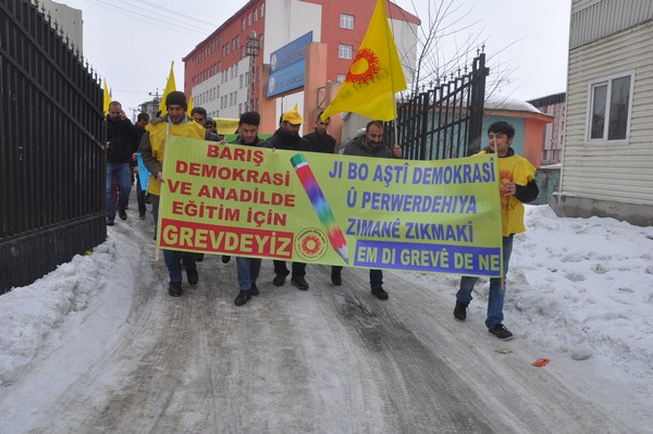 Hakkari'nin Yüksekova ilçesinde Yüksekova Eğitim - Sen Şubesi tarafından alınan grev kararı ile ilgili bir basın açıklaması düzenlendi. Eğitim- Sen şube binası önünde toplanan Eğitim-Sen üyeleri pankartlar taşıyarak ve sloganlar atarak Cengiz Topel Caddesi üzerinden yürüyüşe geçti.