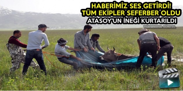 Yüksekova ilçesinde bataklığa saplanan ineğinin başından iki gecedir ayrılmayan Mehmet Emin Atasoy, yapılan çalışmalar sayesinde ineğine kavuştu.