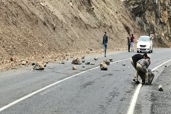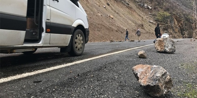 ÇUKURCA-Hakkari'de yağan yağmur nedeniyle Hakkari-Çukurca karayoluna yer yer dağlardan kopan kaya parçalarının karayollarına düşmesi ulaşımda aksamalara neden oluyor.