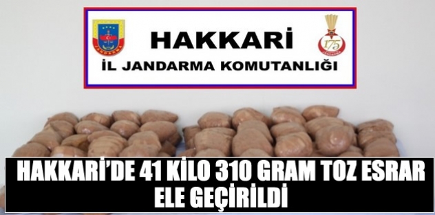 Edinilen bilgiye göre, Hakkari İl Jandarma Komutanlığı tarafından yürütülen toplum destekli güvenlik hizmetleri kapsamında yapılan çalışmalar sonucu Hakkari merkeze bağlı Bağışlı köyü Musahan Mezrasında Zap deresi kenarında bulunan çalılıklara gizlenmiş vaziyette iki çuval içerisinde 41 kilo 310 gram toz esrar ele geçirildi. Olay faillerinin tespit ve yakalanması için çalışmaların devam ettiği belirtildi. İHA