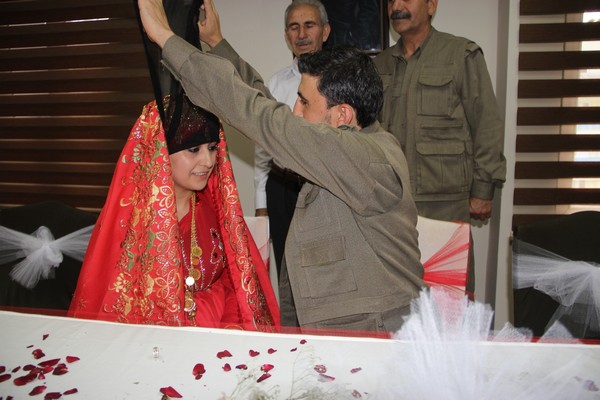 Gelinin annesi DBP ilçe Eş Başkanı Cevahir Kaçar ise Kürtçe olarak bugün kendisinin burada mutluluğu ve üzüntüyü bir arada yaşadığını söyledi. Kaçar, ”Kızımın nikah törenini yöresel kıyafetlerle yaptık. İki oğlum dağda buna rağmen kızımın düğününü yapıyorum. İnşallah bu süreç iyi gider bozulmaz. Dağdakiler de ailelerinin yanına dönerler” dedi.