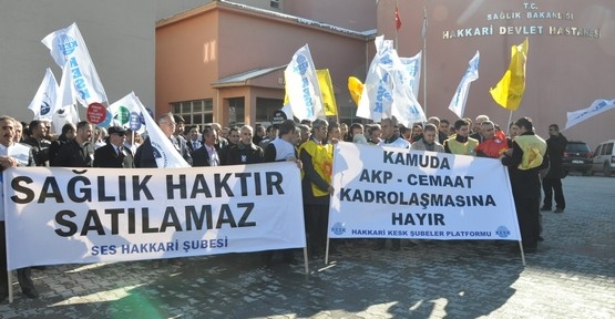 KESK Hakkari Şubeler Platformu üyeleri, kentte yaşanan kadrolaşmaları yürüyüş düzenleyerek, protesto etti. Şube binası önünde biraraya gelen KESK üyeleri, "AKP cemaat kadrolaşmasına hayır" pankartı açarak, "Yaşasın örgütlü mücadelemiz" sloganları atarak, Hakkari Devlet Hastanesi önüne yürüdü.