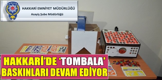 Bir süre önce tombala adı altında kumar oynatan bir iş yerine baskın yaparak buradaki kumar malzemelerini toplayan Hakkari İl Emniyet Müdürlüğü ekipleri, gelen ihbarlar üzerine operasyonlarını sürdürüyor. Hakkari genelinde de umuma açık yerlerde para karşılığı tombala adı altında kumar oynatıldığına dair ihbarlar gelmesi üzerine Hakkari İl Emniyet Müdürlüğü ekipleri harekete geçti. Bulak Mahallesi Altay Caddesi üzerinde faaliyet gösteren bir okey salonunda 1 adet tombala makinesi, 110 adet tombala kartı, 470 adet pul, 90 adet tombala topu ele geçirildi. İş yeri sahibinin gerekli işlemler yapılmak üzere emniyete götürüldüğü belirtildi.İHA