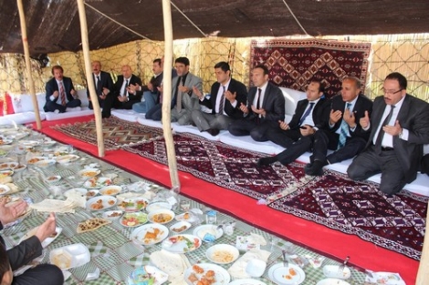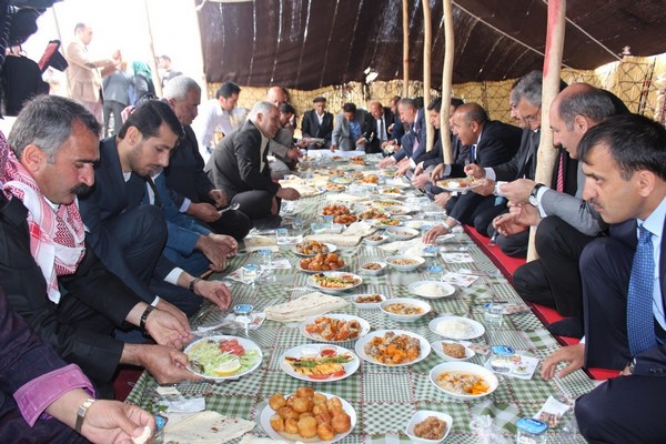 Tanıtım faaliyetleri ile ilgili slayt sunumun ardından programa kültür merkezi binasının bahçesine kurulan kıl çadırda devam edildi. Halk oyunları gösterisinin yapıldığı bahçede vali yardımcıları ve kurum amirleri yöresel minder ve yastıkların bulunduğu kıl çadırda oturarak Hakkarili dengbejlerin seslendirdikleri yerel ezgileri dinlediler. Hakkari’nin yöresel yemeklerinin sunulduğu çadırda, vali yardımcıları Mustafa Temiz, Hüseyin Sayın ve Cengiz Erdem ile kurum amirleri, vatandaşlarla bir araya gelerek kurulan yer sofrasında ikram edilen ‘Doğaba’ ile diğer yerel yemekleri tattılar.