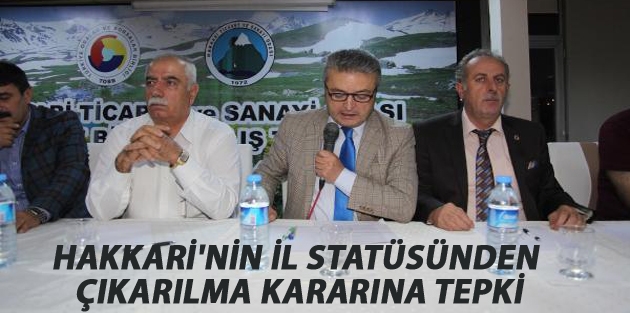Hakkari'nin il statüsünden çıkarılma kararına tepkiHakkari'de Ticaret ve Sanayi Odası öncülüğünde STK temsilcileri, kanaat önrderleri, esnaflar ve muhtarlar Hakkari il merkezinin Yüksekova'ya taşınmasını basın açıklamasıyla protesto etti.