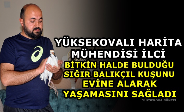Yüksekova ilçesinde yaşayan Harita Mühendisi Rıza İlci, iki gün önce bitkin halde bulduğu sığır balıkçıl kuşunu evine alarak yaşamasını sağladı.