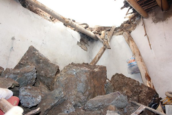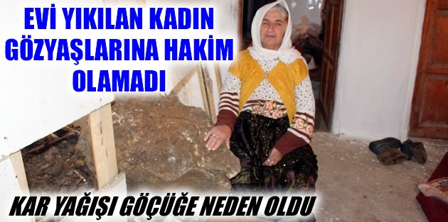 Kar yağışı ile birlikte evlerinin arkasında bulunan taşla örülen istinat duvarının saat 06.00 sıralarında büyük bir gürültü ile çöktüğünü ifade eden Akise Bor, “Eşim yaklaşık 5 yıl önce vefat etti. Çocuklarımla birlikte tek katlı toprak evde kalıyorum. Kar yağışı ile birlikte 2 metre yüksekliğindeki duvar evimizin üzerine çöktü ve evimiz kullanılamaz hale geldi. O sırada çocuğum uykudaydı, büyük kaya parçası tam çocuğumun yastığının üzerine düştü. Şans eseri çocuğum kaçarak yara almadan kurtuldu. Hepimiz evi terk etmek zorunda kaldık. Kendi imkanlarımız ile yıkılan evin tavanına branda çekerek içeriye karın gelmesine engellemeye çalıştık. Kış ortasında evsiz kaldık. Yetkililerin bize yardımcı olmasını istiyoruz” dedi.