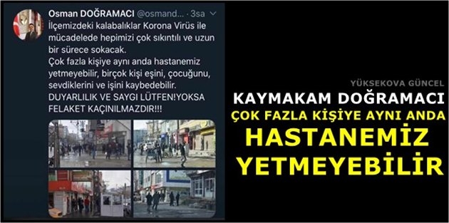 Çin’in Wuhan kentinde başlayan ve Türkiye’de de ölümlere neden olan korona virüsü nedeniyle Yüksekova Kaymakamı Osman Doğramacı duyarlılık çağrısı yaptı.