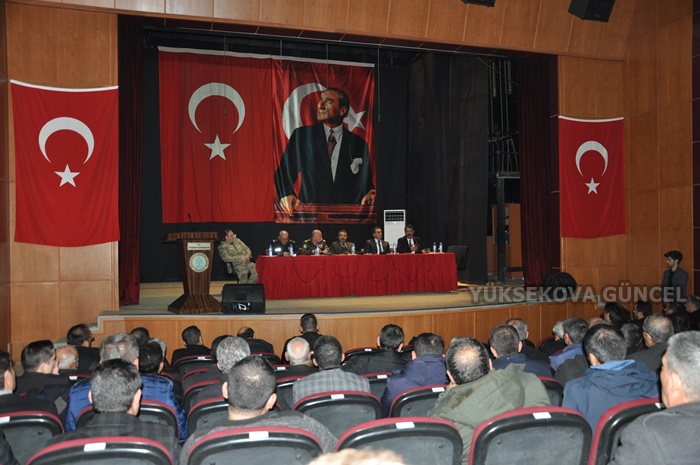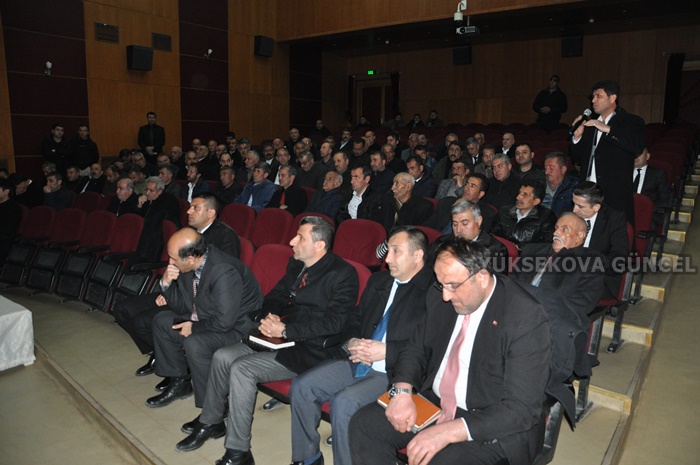 Selahaddin Eyyubi Kültür Merkezinde düzenlenen aylık değerlendirme toplantısına köy ve merkez mahalle muhtarlarının yanı sıra Hakkari İl Emniyet Müdürü Süleyman Suat Dilberoğlu, Yüksekova İlçe Emniyet Müdürü Haluk Baş, İlçe Jandarma Komutanı Binbaşı Volkan Gürler, Yüksekova Belediye Başkan Yardımcısı Bayram Özcan, VEDAŞ Hakkari İl Müdürü İsmail Özdemir ve kurum amirleri katıldı. Saygı duruşu ve İstiklal Marşı'nın okunmasıyla başlayan program, Yüksekova'da yapılan çalışmaların gösterildiği slayt sunumuyla devam etti. Burada konuşan Kaymakam Kendüzler, altyapı çalışmaları sonrası vatandaşların toz, çukur ve çamur eleştirilerine değinerek, "Bir insanda böbrek ve bağırsak arızalı ise saçı ve başı düşünülemez.