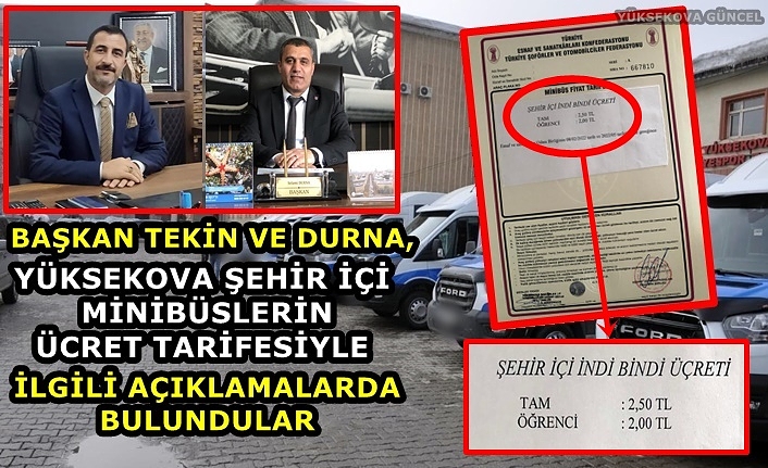 Hakkari Esnaf ve Sanatkarlar Odaları Birliği Başkanı Muharrem Tekin ve Yüksekova Şoförler ve Otomobilciler Esnaf Odası Başkanı Selami Durna, (Yüksekova Şehir İçi Minibüsler) için Yapılan ücret tarifesi zammıyla ilgili yazılı açıklamalarda bulundular.