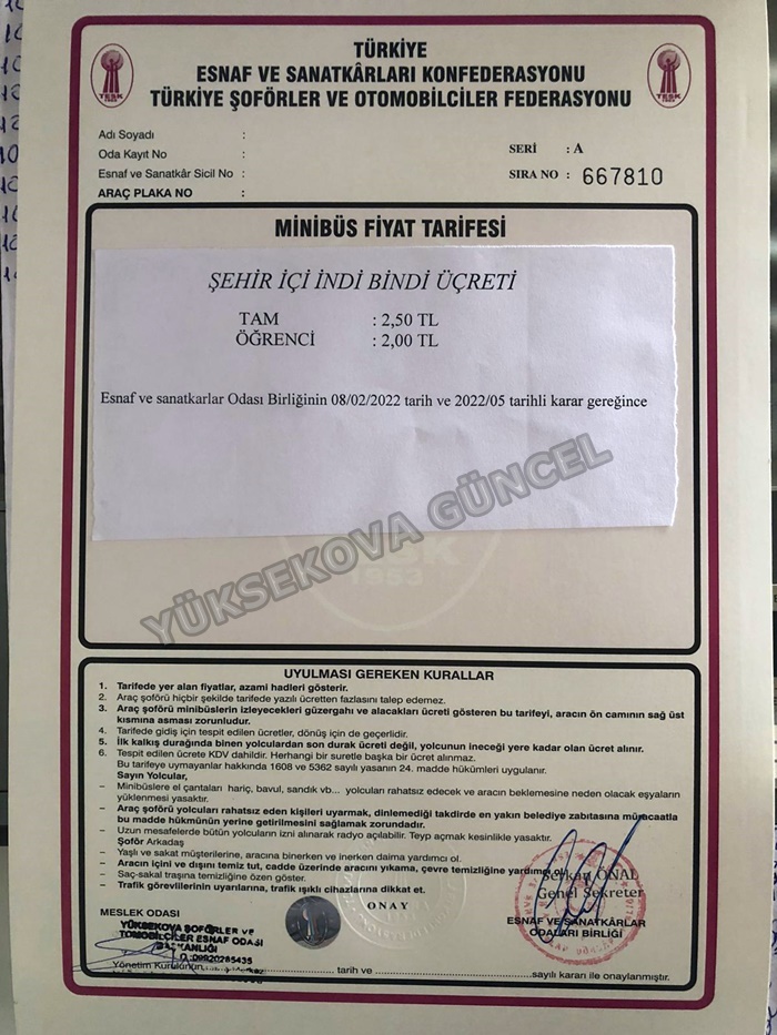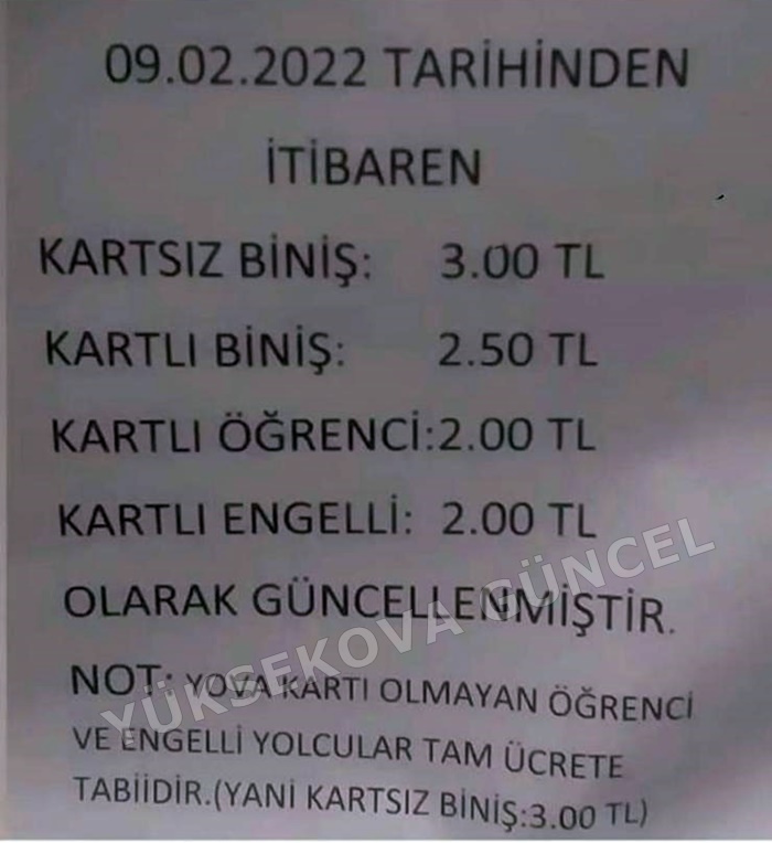KAMUOYUNUN BİLGİSİNE,''Değerli Yüksekova Halkı 08.02.2022 tarihinden itibaren geçerli olmak üzere şehir içi toplu taşıma ücretlerine 50 kuruş zam yapılma zorunluluğu doğmuştur. Toplu taşıma ücretleri ile ilgili aldığımız kararda kartlı veya kartsız biniş şeklinde bir uygulama veya tarife söz konusu değildir. Minibüsçü esnafına dağıtılan normal A4 kağıdına yazılan tarife toplatılmış olup, resmi Fiyat Tarifeleri Yüksekova Şoförler Odamız tarafından Minibüsçü esnafına dağıtılmıştır.