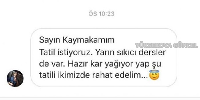 Yüksekova ilçesinde kar yağışı etkili olurken, öğrenciler de sosyal medyadan Kaymakam Ramazan Kendüzler'e 'tatil' mesajı yağdırdı. ilçesinde kar yağışı etkili olurken, kar tatili isteyen öğrenciler sosyal medyadan Kaymakam Ramazan Kendüzler'e 'tatil' mesajı yağdırdı.