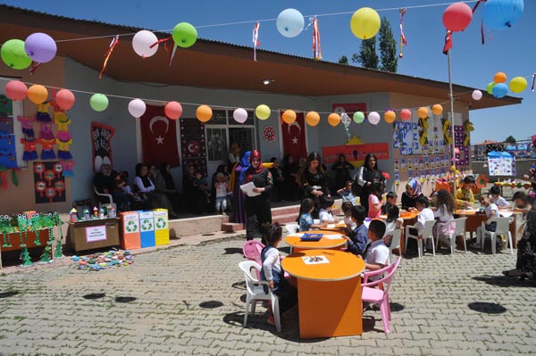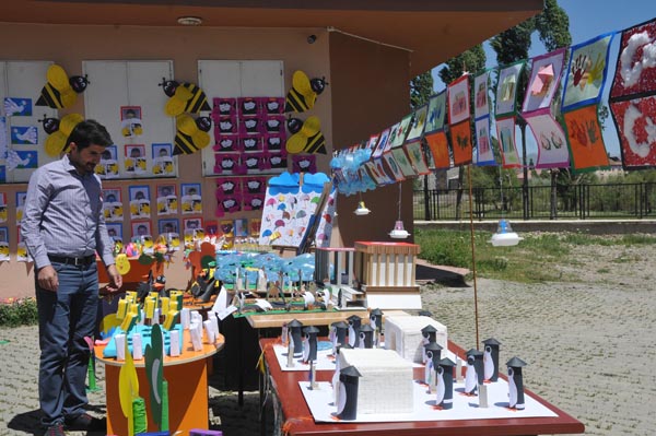 Öğrencilerin öğretmenlerin yardımıyla yıl boyunca yaptıkları resimler, atık maddelerden yararlanarak yapılan masaüstü materyalleri okul bahçesinde sergilendi.