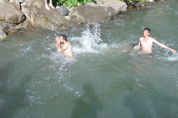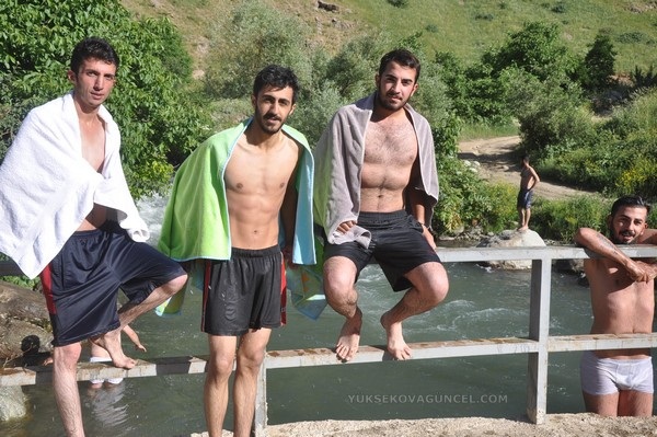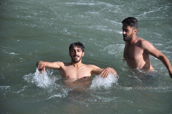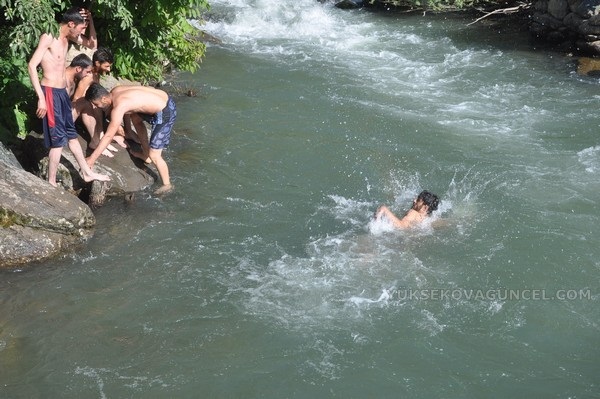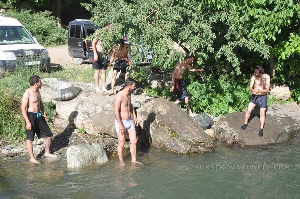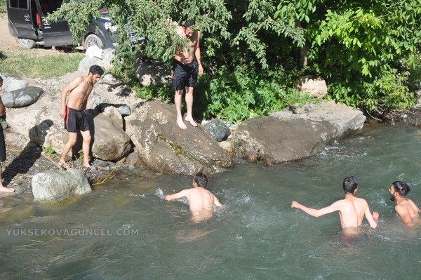 Yüksekova ilçesinden hava sıcaklığının mevsim normallerinin üzerinde seyretmesi sebebiyle sıcaktan bunalan vatandaşlar, Dağlıca bölgesinde bulunan Veregoz yaylasındaki ırmakta serinliyor.